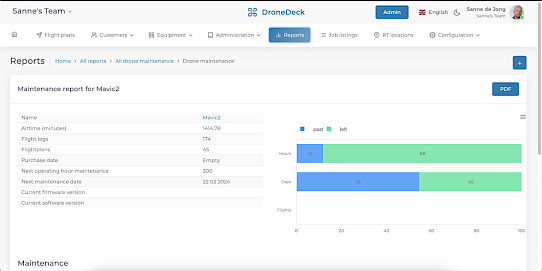 De onderhoudsmanager van de drone kan al het onderhoud aan een drone rapporteren. In DroneDeck wordt al het onderhoud bijgehouden in onderhoudsrecords. Deze records zijn het bewijs dat het onderhoud is uitgevoerd. DroneDeck houdt ook bij op welke momenten het onderhoud moet plaatsvinden. Dit op basis van een datum in de toekomst van een aantal vlieguren.