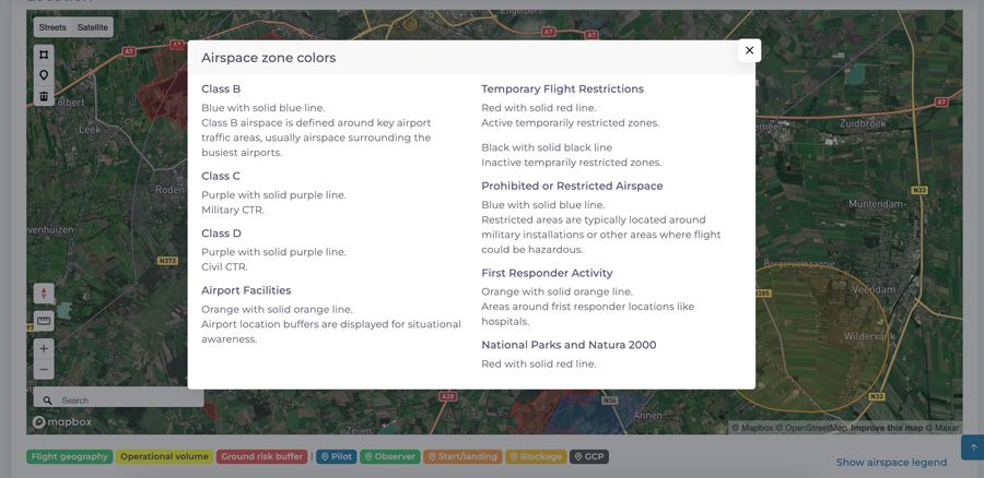 If you are not sure what type of airspace you clicked, just click on Show airspace legend for an explanation. Currently we have the following airspace zones in DroneDeck.
