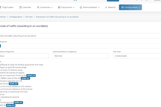 Bij de risicoconfiguratie is het risiconiveau toegevoegd. Deze staat los van de kans en impact. Het risiconiveau geeft weer in welke mate je comfortabel bent met dit risico. Dit risico geef je aan zowel voor als na de mitigerende maatregelen. Er is altijd een risico tijdens een droneoperatie, het gaat er om hoe gevaarlijk je deze inschat. Daarbij komt ook kijken hoe je er mee omgaat.